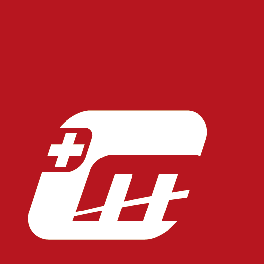 Das Hauptlogo ist einzeilig mit schwarzer Schrift und rotem Swisslabel.