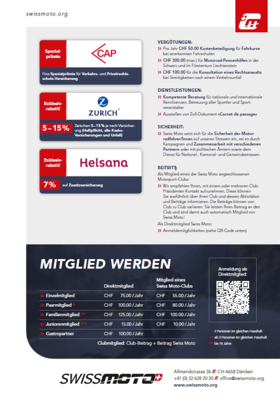 Mit deiner Mitgliedschaft im Schweizerischen Motorradfahrerverband SWISS MOTO unterstützt du die Interessen der Schweizer Motorradfahrer/innen und des Schweizer Motorradsports.