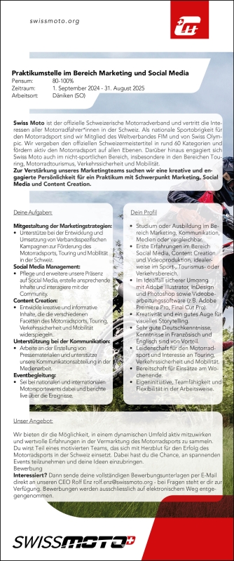 Praktikum im Bereich Marketing und Social Media bei Swiss Moto (80 - 100%)